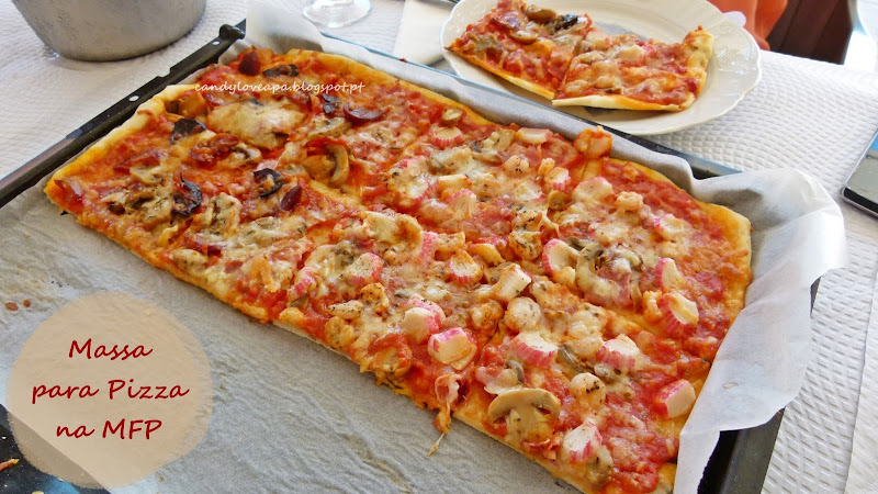 No dia anterior ao almoço, fiz a massa na máquina de fazer pão, onde foi amassada e onde levedou. Deixei-a durante a noite no frigorífico e no dia a seguir estiquei-a. A massa com as quantidades que aqui vos dou, deu para dois tabuleiros (daqueles quadrados que vêm com os fornos). Podem sempre dividir a massa e congelar uma parte para usarem mais tarde.